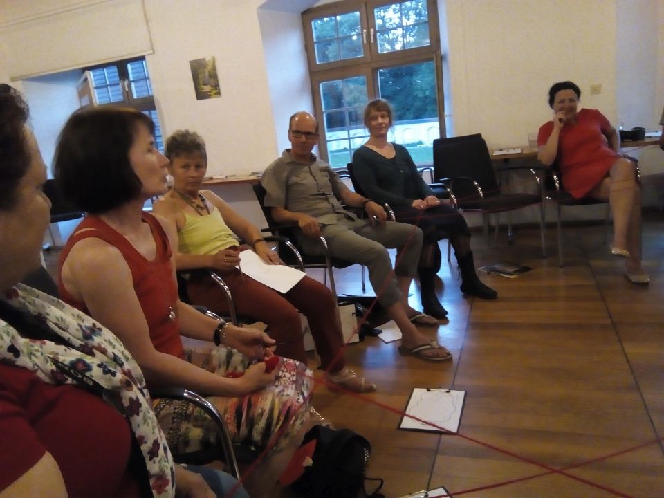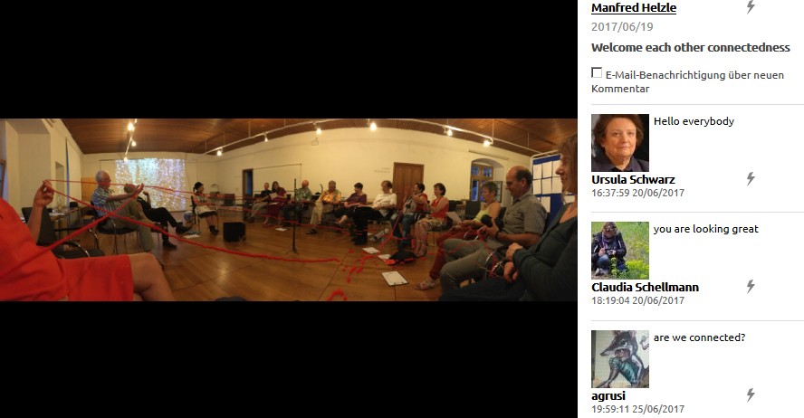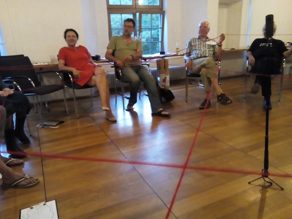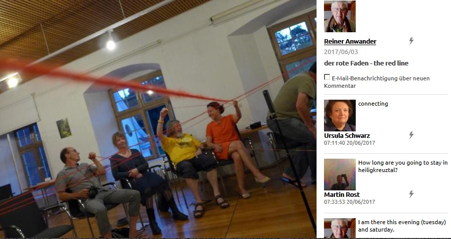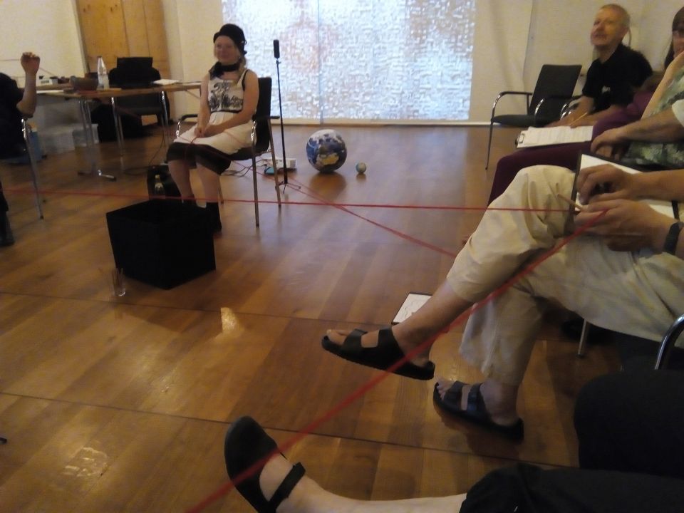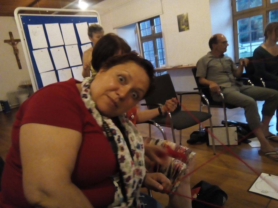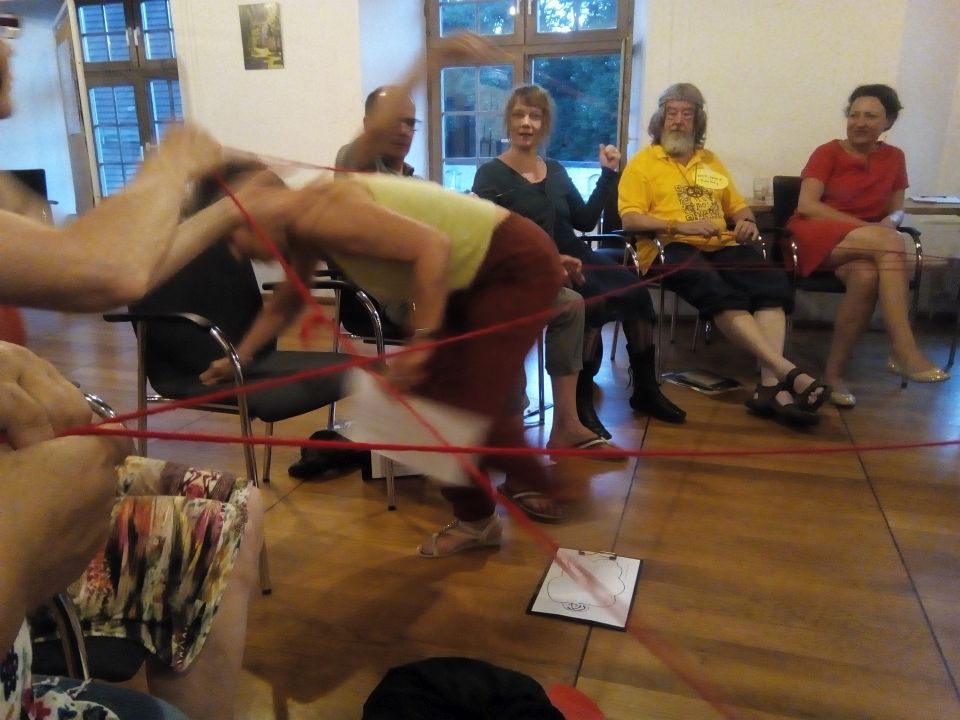 Wir turnen unter Fäden herum.  Ja, Menschen sind miteinander vernetzt. Jeder zeigt ein Mitbringsel. Ich
