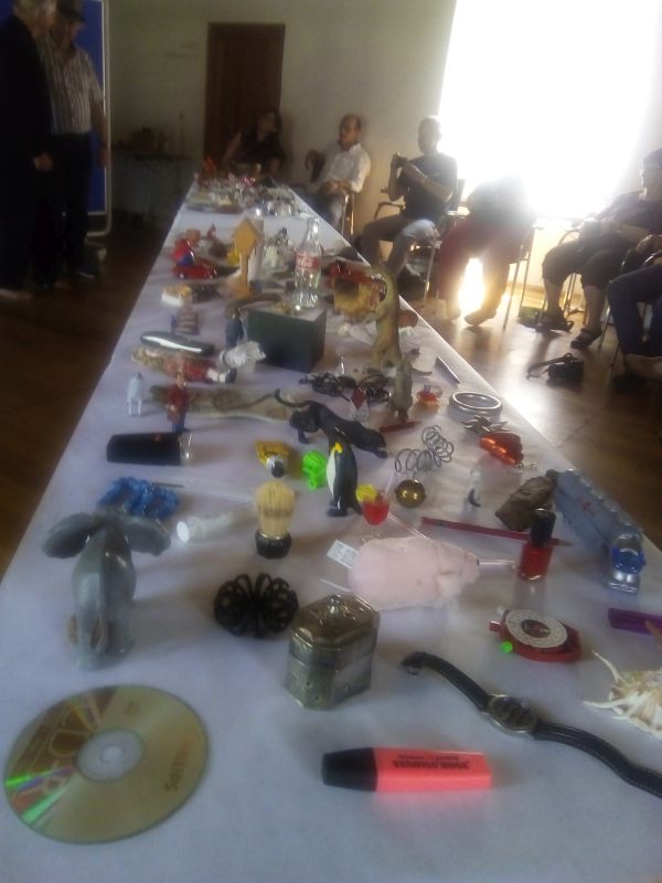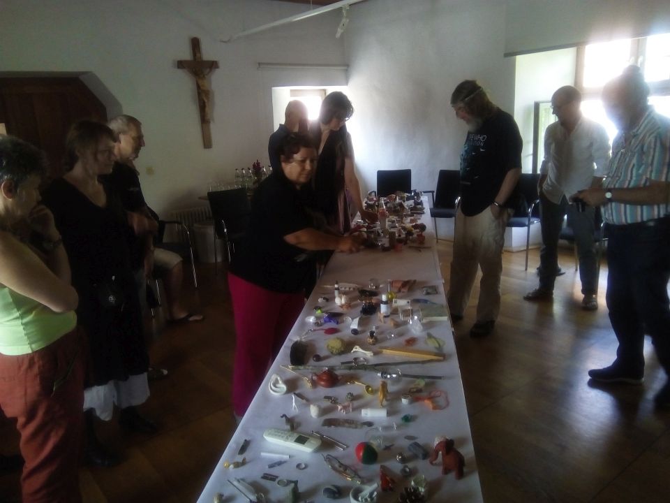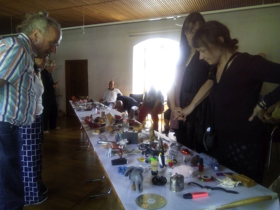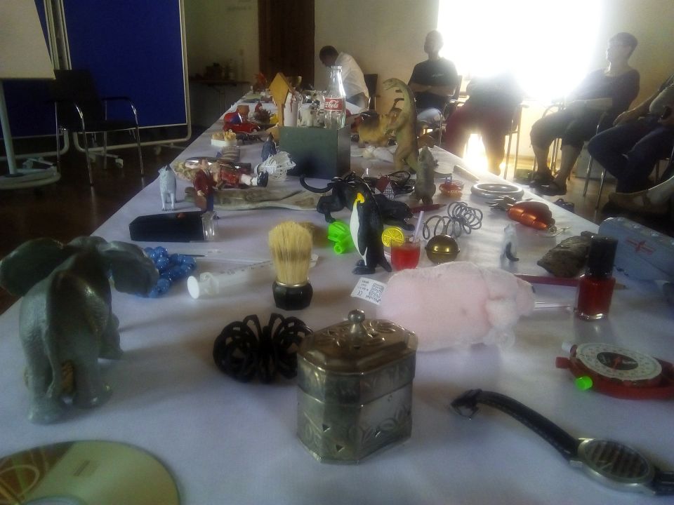 Künstlerische Reihung: Im Workshop gab es einen Overkill an Klein-Objekten, mit der Botschaft der anfänglichen Zufälligkeit, mit Aufgaben des Sortierens.