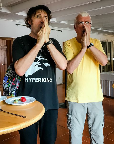 Doch da: Zwei Gestalten heben die Hände vor den Mund, und....